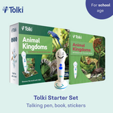- This Starter Set contains the Tolki Talking Pen, the Book ‘Tolki Animal Kingdom’, 108 Tolki stickers as well as pen accessories: charging/connecting cable, adapter for the cable, pen stand and handbook.